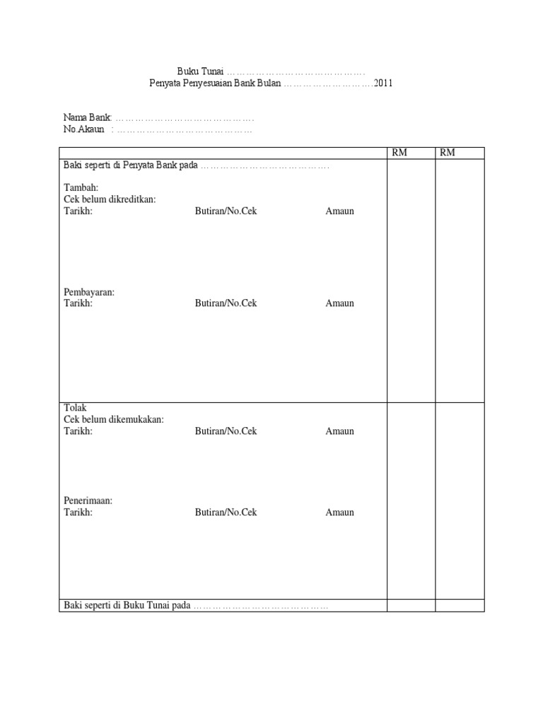 You can create one as well, really easily.get started. I untuk menghitung baki tunai di tangan ii untuk menentukan jumlah modal perniagaan iii untuk menyemak ketepatan catatan dalam buku tunai iv untuk mengetahui bayaran dan deposit. Best online business bank account for startups and smes: Penerimaan dan pembayaran tunai mesti dikawal dengan baik. Apakah kegunaan penyata bank kepada peniaga? Kita sebenarnya kena pastikan yang… baki buku tunai yang belum diadjust tu, sama dengan baki penyata bank. Salinan itu disebut penyata bank. Rekonsiliasi bank rekonsiliasi bank penyesuaian bank adalah dokumen yang memadankan baki tunai pada buku syarikat dengan jumlah yang sesuai pada penyata banknya. Penyata bank digunakan oleh pelanggan untuk penyata penyesuaian bank akan disediakan apabila baki yang ditunjukkan dalam penyata bank tidak sama dengan baki dalam buku tunai bagi bulan berkenaan. Penyata penyesuaian bank penyata penyesuaian bank. Download lagu 11 penyata penyesuaian bank mp3 dan video mp4. Apa yang kita kena buat masa dapat soalan ppb ni? Sila semak latihan ini dalam website tingkatan 5 dan cetak.