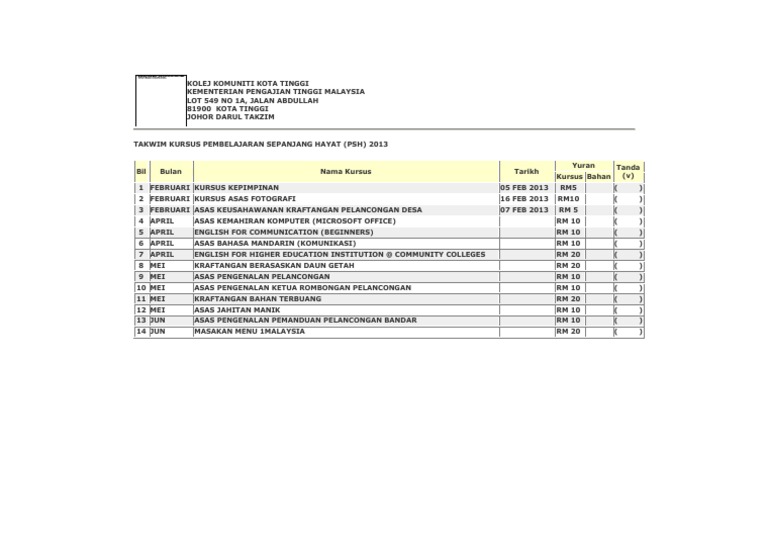 Kolej Komuniti Kota Tinggi - Kota tinggi merupakan salah sebuah daerah yang terdapat di negeri johor, malaysia.. Jarak kota tinggi lebih kurang 42 km dari bandaraya johor bahru. Setakat ini terdapat 103 buah kolej komuniti di berbagai lokasi di setiap negeri di seluruh kolej komuniti berada di bawah kendalian jabatan pendidikan politeknik dan kolej komuniti (jppkk), kementerian pendidikan malaysia (kpm). Malaysia · 1 decade ago. Savesave kpi kolej komuniti kota tinggi for later. Smk laksamana (24 julai 2014) 4.
