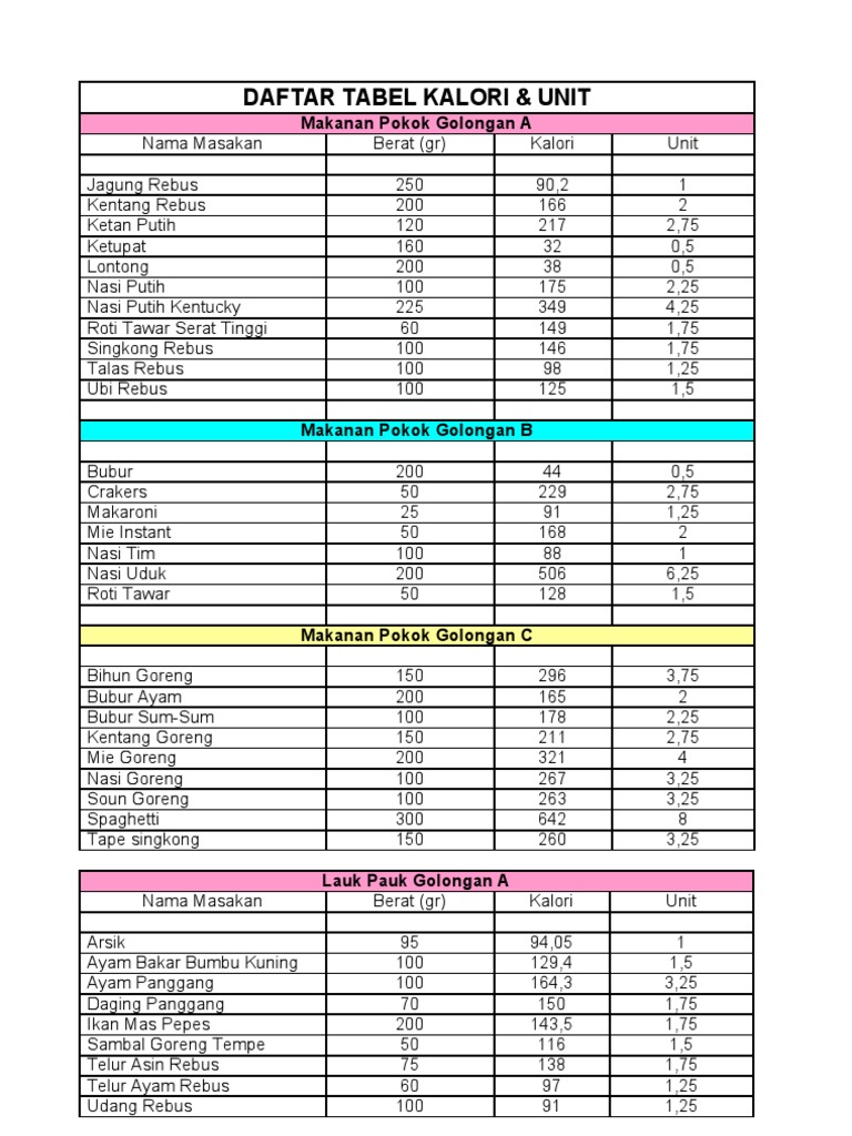 Ini Tentang Hidup: Tabel kalori from 1.bp.blogspot.com Makanan wajib bagi masyarakat indonesia ini. Kebutuhan kalori per orang dalam sehari umumnya berkisar di angka 2.000 kalori, tetapi jumlah kalori tiap orang bisa berbeda, bergantung dari usia, jenis kelamin, aktivitas harian, dan massa otot. Kekurangan asupan kalori dalam waktu lama akan menyebabkan underweight (berat badan rendah), atrofi otot, lemahnya kekebalan tubuh dan kegagalan organ tubuh. Pilihan makanan yang mengandung kalori tinggi. Oleh itu, beberapa jenama akan merangkumi maklumat kalori. Oleh karena semua makanan kemasan harus mencantumkan komposisi misalnya, ayam berkulit memiliki kandungan lemak dan kalori lebih banyak dari yang tidak berkulit. Apakah ada kalori di dalam kandungan air putih? Atau lebih tepat lagi, ia adalah jumlah tenaga yang diperolehi daripada makanan dan minuman yang akan kita perlukan untuk melakukan pekerjaan seharian.