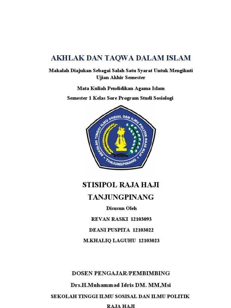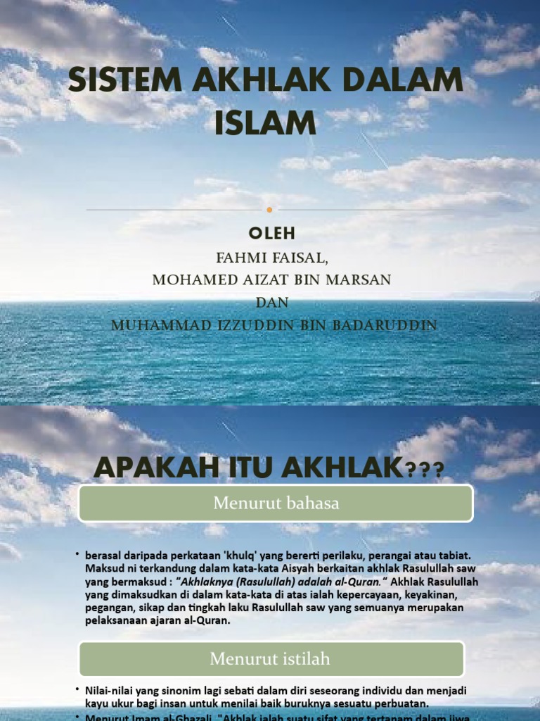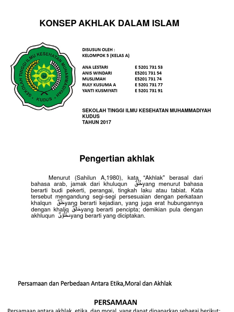 Dalam makalah ini juga menjelaskan perbedaan antara akhlak, moral dan etika dalam islam. Selain itu , remaja kini pandai dari segi akademik tetapi buruk dari segi akhlak mereka. Kepentingan akhlak islam nabi muhammad s.a.w telah menggariskan matlamat utama kerasulan baginda dan metodologi dakwah baginda adalah untuk menyempurnakan akhlak manusia sebagaimana sabda baginda s.a.w ; Akhlak merupakan buah yang dihasilkan dari proses menerapkan aqidah dan syariah/ibadah. Karena itu, saya meragukan klaim penegakan syariah islam tetapi tidak tercermin dalam akhlak pengusungnya, baik akhlak kepada allah, akhlak. Manifestasi kepentingan akhlak dalam kehidupan manusia, islam menyusun dengan begitu rapi. Ini dapat dilihat dari beberapa sudut: Akhlak dalam islam sangat penting. Ibnu miskawaih dalam kitab tahdzibul akhlak menjelaskan bahwa khuluk ialah keadaan gerak jiwa yang mendorong kearah melakukan perbuatan tanpa pertimbangan dan pemikiran. Wahai abu dzar, maukah engkau aku tunjukkan tabiat yang ringan di punggung akan tetapi berat di timbangan amal? Karena dari jiwa itulah tabiat dan perilaku atau akhlak seseorang muncul. Berbagai motif dan tujuan menjadi pemicunya. Karena pada saat itu akhlak masyarakat terutama jahiliyah masih jauh dari perilaku akhlak yang terpuji.